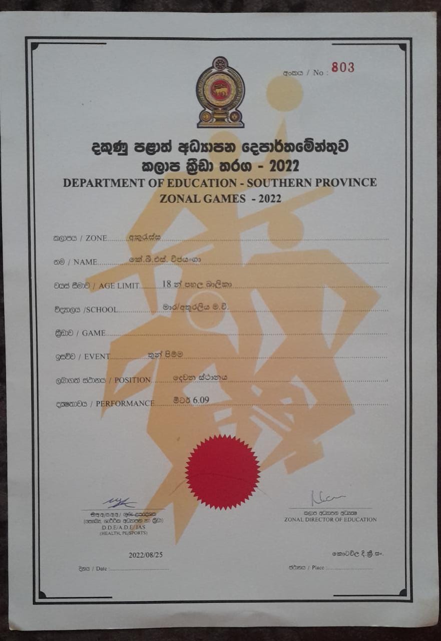 2022 වර්ෂයේ දකුණු පළාත් කලාප ක්රීඩා තරඟ වලදී තරඟ ඉසව් කිහිපයකින්ම ජයග්රහණ කිහිපයක් දිනා ගැනීමට හැකියාව ලැබී ඇත.